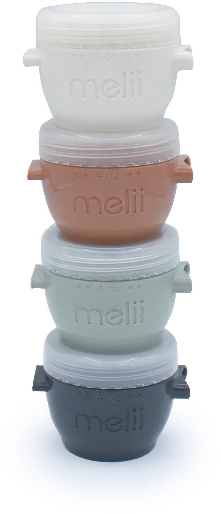 Dózy na potraviny na příkrmy, na pochutiny, minikrabičky, dózičky, na zamrazení, do mrazničky, snackboxy Sada Melii Snap & Go obsahuje 4 kelímky o objemu 118 ml. Kelímky jsou vhodné na příkrmy, dětské svačinky, dipy k hlavnímu jídlu i porce oříšků či sušeného ovoce. Snadno se vejdou do větších svačin
