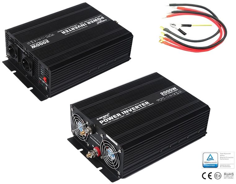Menič napätia z 24 V na 230 V – do nákladného automobilu, pripojenie do autobatérie, trvalý výkon 2000 W, špičkový výkon 4000 W, modifikovaná sínusoida, 2 zásuvky, aktívny ventilátor, softstart, ochrana proti prepätiu a konektor USB súčasťou Tento nový menič napätia sa ponúka ako výborná voľba v oblasti meničov z 24 V na 230 V. Jeho výhodnými vlastnosťami sú určite kompaktnosť a vysoká efektivita. Ponúka tiež spoľahlivosť, stabilný výkon