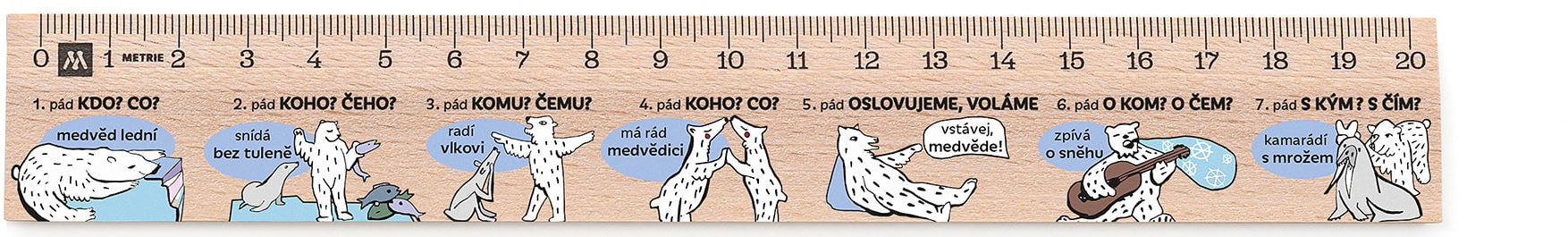 Pravítko – drevené, dĺžka 20 cm, viacfarebné vyhotovenie Kľúčové vlastnosti pravítka METRIE Didakt M02 drevené, gramatické pády, 20 cm Pravítko Metrie je zhotovené z dreveného materiálu Na dĺžku má 20 cm S viacfarebným dizajnom