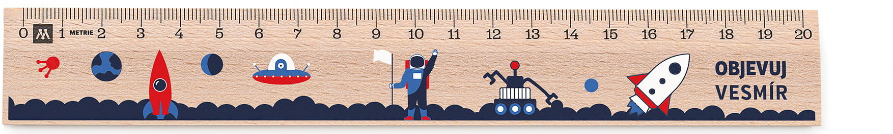 Pravítko – drevené, dĺžka 20 cm, viacfarebné vyhotovenie Kľúčové vlastnosti pravítka METRIE Didakt M02 drevené, objavuj vesmír, 20 cm Pravítko Metrie je zhotovené z dreveného materiálu Na dĺžku meria 20 cm Vo viacfarebnom vyhotovení
