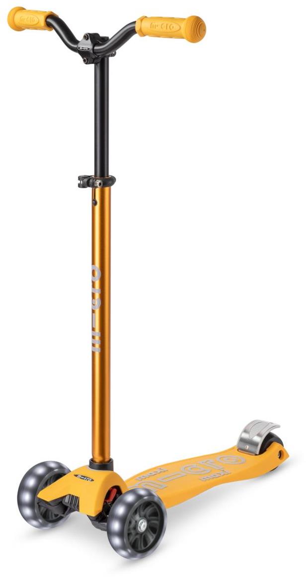Detská kolobežka pre deti od 5 rokov, trojkolesová, nosnosť 50 kg, výška riadidiel 72 – 91 cm, rám: plast, hmotnosť 2,5 kg Micro Maxi Deluxe Pro LED je bezpečná, stabilná a zábavná kolobežka určená pre deti vo veku od 5 do 12 rokov s odporúčanou nosnosťou do 50 kg. Táto trojkolesová kolobežka je vybavená nášľapnou doskou