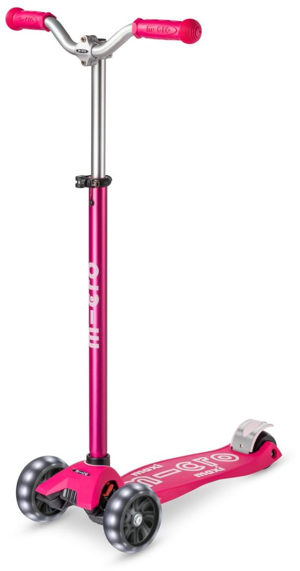 Detská kolobežka pre deti od 5 rokov, trojkolesová, nosnosť 50 kg, výška riadidiel 72 – 91 cm, rám: plast, hmotnosť 2,9 kg Micro Maxi Deluxe Pro LED je stabilná trojkolesová kolobežka pre deti určená primárne na kratšie vychádzky. Má nastaviteľnú výšku riadidiel v rozsahu 72 – 91 cm, nášľapnú brzdu pri zadnom kolese a náš