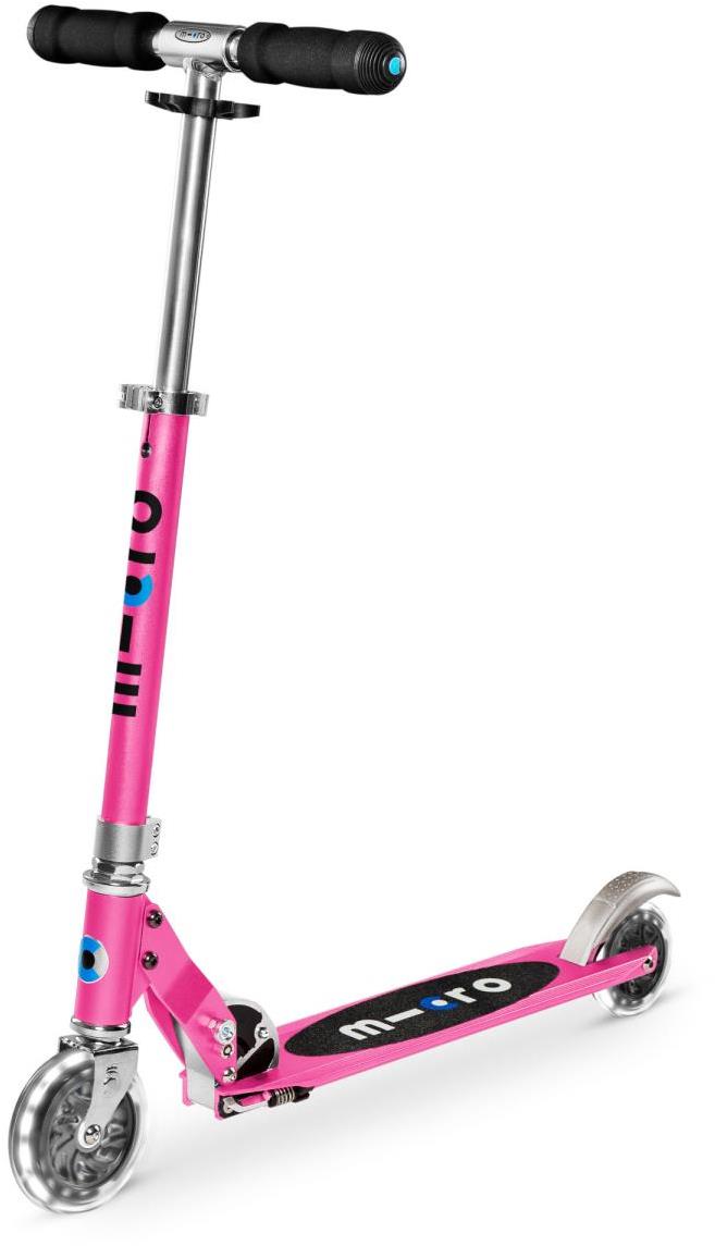 Skladacia kolobežka , nosnosť 100 kg, max. výška riadidiel 93 cm, materiál rámu: hliník, nášľapná brzda, hmotnosť 2,85 kg Micro Sprite LED pink je ľahká a kompaktná dvojkolesová skladacia kolobežka, ideálna do mesta a na kratšie výlety. Má plynule nastaviteľnú výšku riadidiel v rozsahu 64 – 93 cm, stojan a nášľapnú brzdu