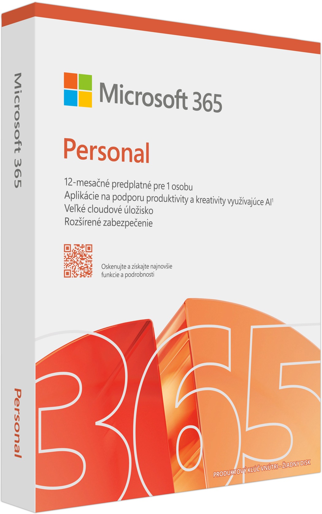 Kancelársky softvér – fyzická licencia (predplatné – jednorazová licencia), pre 5 zariadení, aplikácia Word, Excel, PowerPoint, Outlook, OneNote, OneDrive a Teams súčasťou, dĺžka predplatného 12 mesiacov, na mobilné zariadenie a PC, kompatibilný s operačným systémom Windows, macOS, Android a iOS, prenosná licencia Microsoft 365 pre jednotlivcov CZ (BOX)Microsoft 365 pre jednotlivcov zahŕňa 1 TB cloudového úložiska, pokročilé zabezpečenie a inovatívne aplikácie s podporou Al.Pre jednotlivcovMožnosť používania až