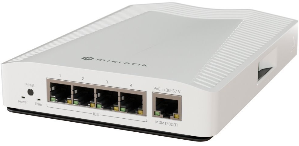Router – desktop, 2-jadrový procesor s frekvenciou 1200 MHz, podporuje protokoly NAT a IPv6, porty 5× RJ-45, LAN porty s rýchlosťou 4× 10 Gbit LAN, 1× 1 Gbit LAN, prepínacia kapacita 80 Gb/s, PoE štandard 802.3af (PoE) a 802.3at (PoE+), napájanie zo siete, PoE a 2-pin svorkovnica, operačná pamäť 512 MB, rozmery 35 × 128 × 176 mm (V׊×H) Praktický a užitočný router Mikrotik je vhodným riešením na doplnenie jednoduchších aj zložitejších sietí a prekvapí mnohými užitočnými funkciami. Router pracuje s operačnou pamäťou s veľkosťou 512 MB
