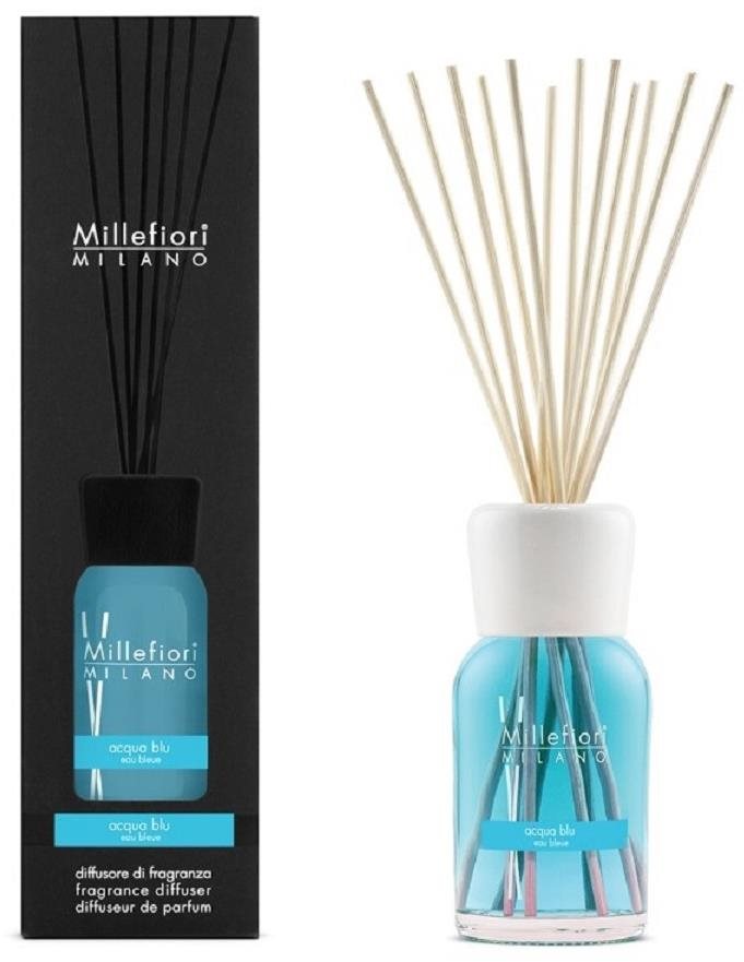 Tyčinkový difuzér – svieža vôňa s výdržou 180 d, sklenená nádoba, 12 tyčiniek, dĺžka tyčiniek 35 cm, objem 500 ml MILLEFIORI Milano Acqua Blu je elegantný difuzér s vonnými tyčinkami, ktorý okamžite premení váš interiér na oázu pokoja a harmónie. Táto svieža vodná vôňamieša citrusové a kvetinové tóny s morským ak