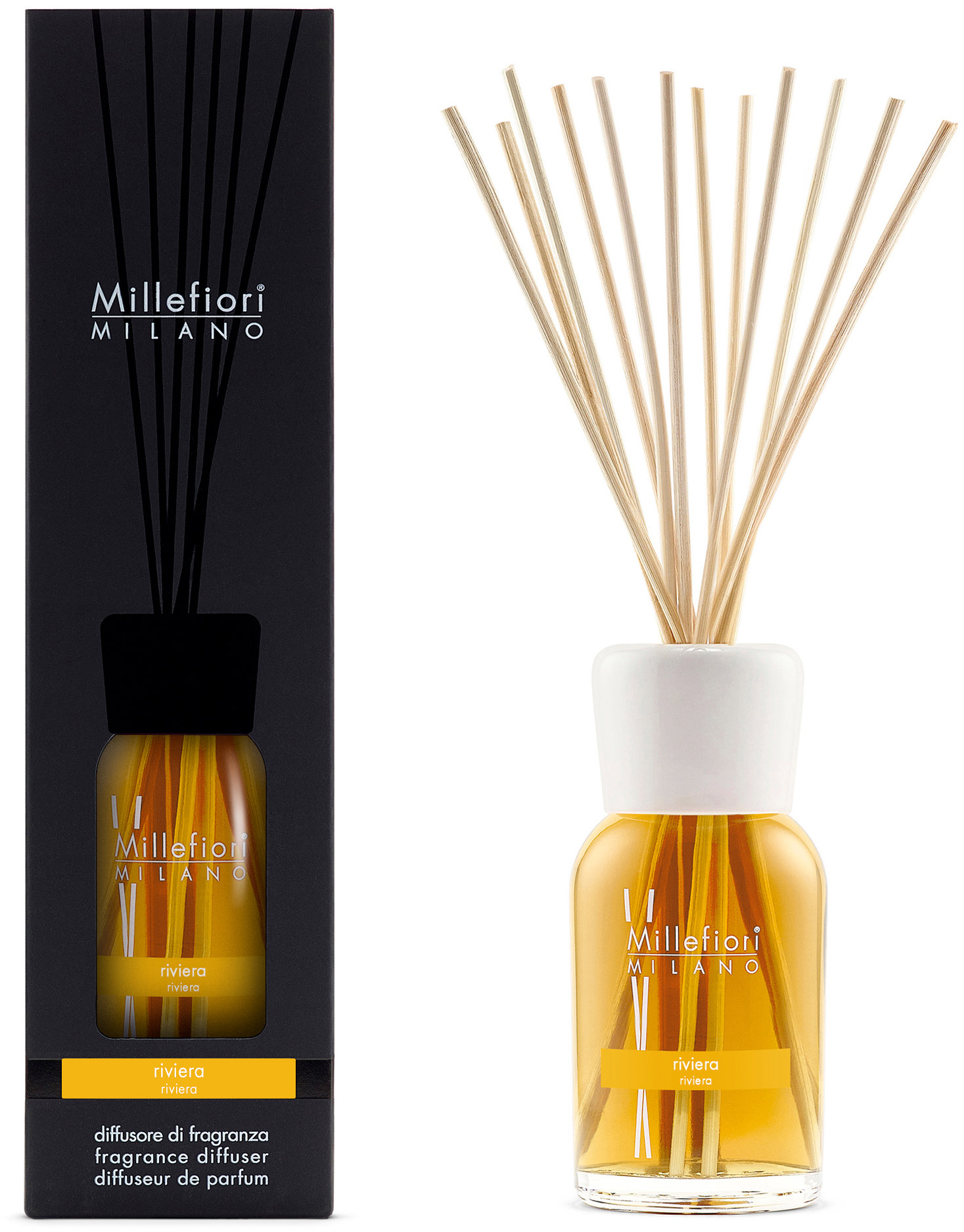 Tyčinkový difuzér – ovocná vôňa, sklenená nádoba, 12 tyčiniek, dĺžka tyčiniek 35 cm, objem 500 ml Elegantní Tyčinkový difuzér MILLEFIORI MILANO Riviera s ovocnou vůní je dodáván ve skleněné nádobě o objemu 500 ml a spolehlivě provoní váš domov až na 6–7 měsíců (cca 180 dní). Součástí je 12 přírodn