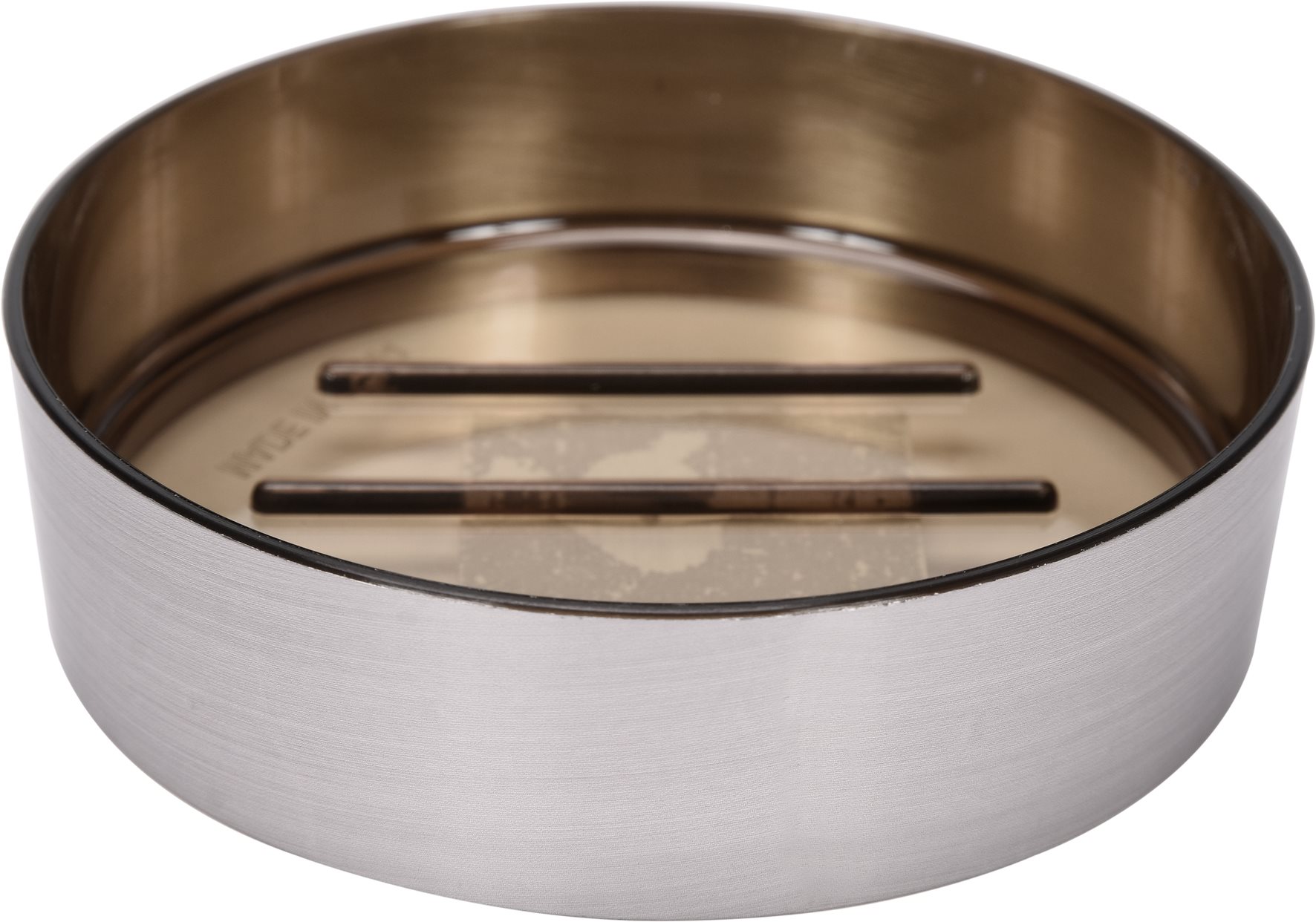 Mydelnička – voľne stojacia, kruhový tvar, materiál plast, sivá a hnedá farba, výška 3 cm Praktická a funkčná miska na mydlo NIKEL zabezpečí pohodlné používanie kúpeľne. Odolný plast v kombinácii s oceľovým, niklovaným povrchom pôsobí elegantným dojmom a hodí sa aj do luxusných int