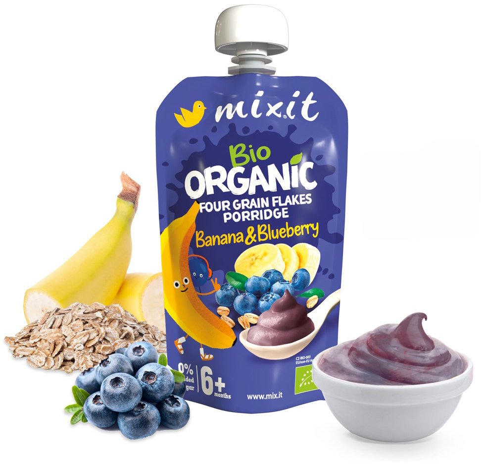 Kapsička pre deti – ovocné, pre deti od 6 mesiace, bez pridaného cukru, bez palmového oleja, bez laktózy, v balení 1 ks Mixit BIO kapsička – Banán a čučoriedkaMixit BIO kapsička – Banán a čučoriedka obsahuje okrem bio banánu a bio čučoriedok aj bio vločky z ekologického poľnohospodárstva. Na dodanie komplexných živín o
