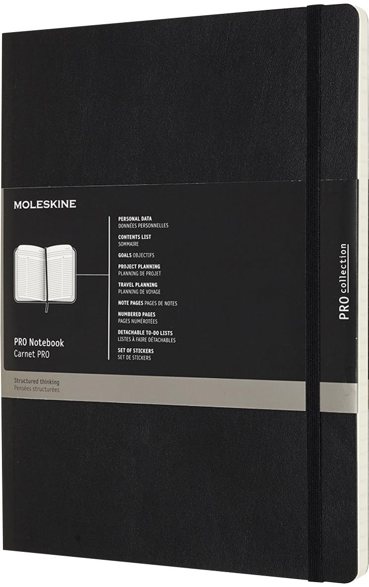 Zápisník – formát B5, 192 listov, linajkový papier, mäkká väzba, materiál dosiek kartón, šitý chrbát, s gumičkou, s textilnou záložkou, vrátane vrecka, čierna farba Stylový zápisník MOLESKINE Professional XL je skvělým spojením vlastností diáře i zápisníku. Dny a data doplníte podle vašich potřeb, díky čemuž lze použít pro každý den libovolný počet stran.