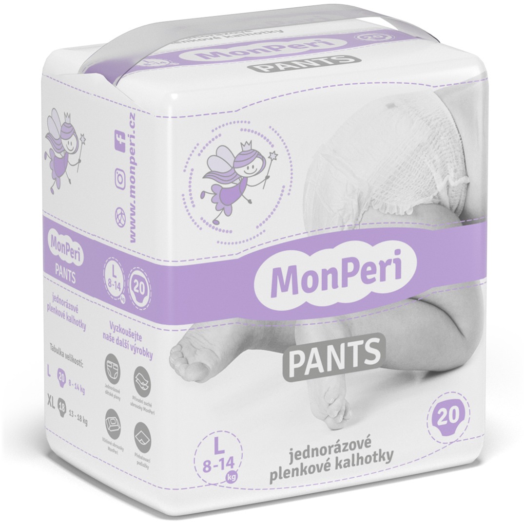 Plienkové nohavičky – jednorazové, veľkosť 4, pre deti od 8 do 14 kg, indikátor vlhkosti, hypoalergénne, predchádzajú vzniku zaparenín, elastický pás, bez parfumovania, bez bielenia chlórom, naťahovacie, v balení 20 ks Plienkové nohavičky MonPeri Pants sa ľahko naťahujú aj vyzliekajú, nezosúvajú sa a vďaka bielemu dizajnu nie sú pod oblečením takmer vidieť. Nohavičky neobsahujú PVC, chlór, antioxidanty ani ďalšie ne