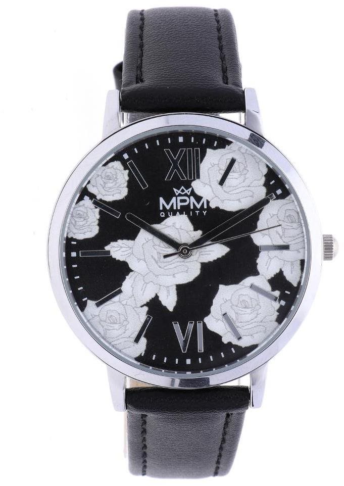 Hodinky dámske – analógové zobrazenie času, strojček quartz, okrúhly ciferník, elegantné, rímske indexy, minerálne sklíčko, vodotesnosť 50 m (5 ATM), materiál puzdra alloy, strieborná farba puzdra, materiál remienka koža, čierna farba remienka MPM Flower A W02M.11270.A sú špičkové dámske náramkové hodinky vhodné pre každého, kto hľadá na svoju ruku spoľahlivého parťáka. Ich základom je okrúhly ciferník široký 36 mm. Takzvané Quartz riešenie