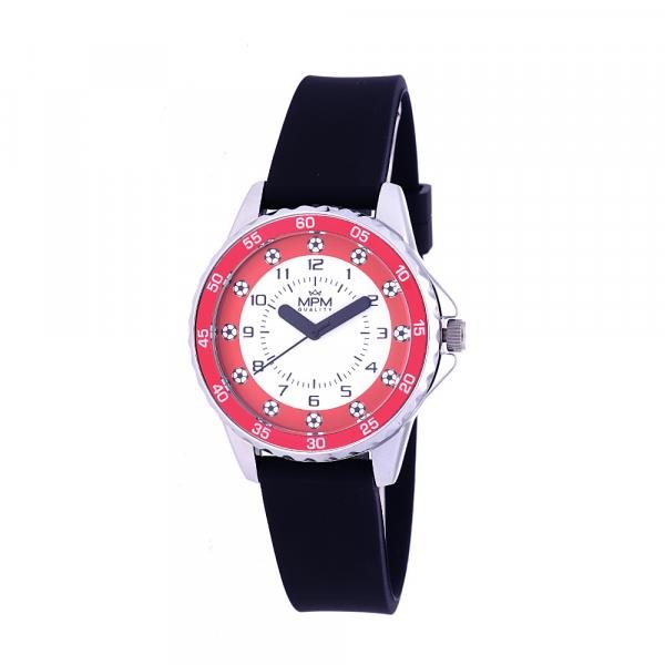 Detské hodinky – quartz, farba remienka čierna, priemer ciferníka 35 mm, materiál remienka silikón, vodotesnosť 50 m (5 atm), sklíčko minerálne MPM SOCCER BALLS W05M.11307.D sú pekné detské hodinky vhodné na každodenné nosenie. Tvorí ich okrúhly ciferník s priemerom 35 mm. Spoľahlivá Quartz technológia bude vždy zárukou vysokej spoľahlivosti