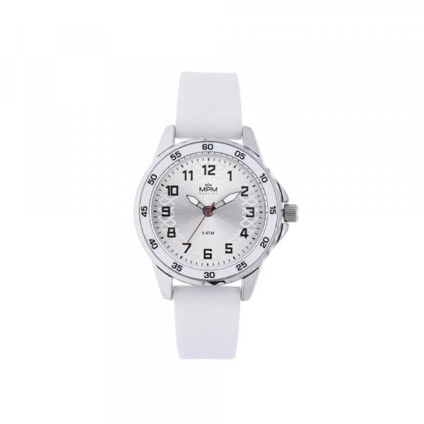 Detské hodinky – quartz, farba remienka biela, priemer ciferníka 35 mm, materiál remienka silikón, vodotesnosť water resistant, sklíčko minerálne MPM STYLE JUNIOR W05M.11223.A sú pekné detské hodinky vhodné na každodenné nosenie. Tvorí ich okrúhly ciferník široký 35 mm. Osvedčená technológia Quartz je zárukou vysokej spoľahlivosti a dlhej výdrž