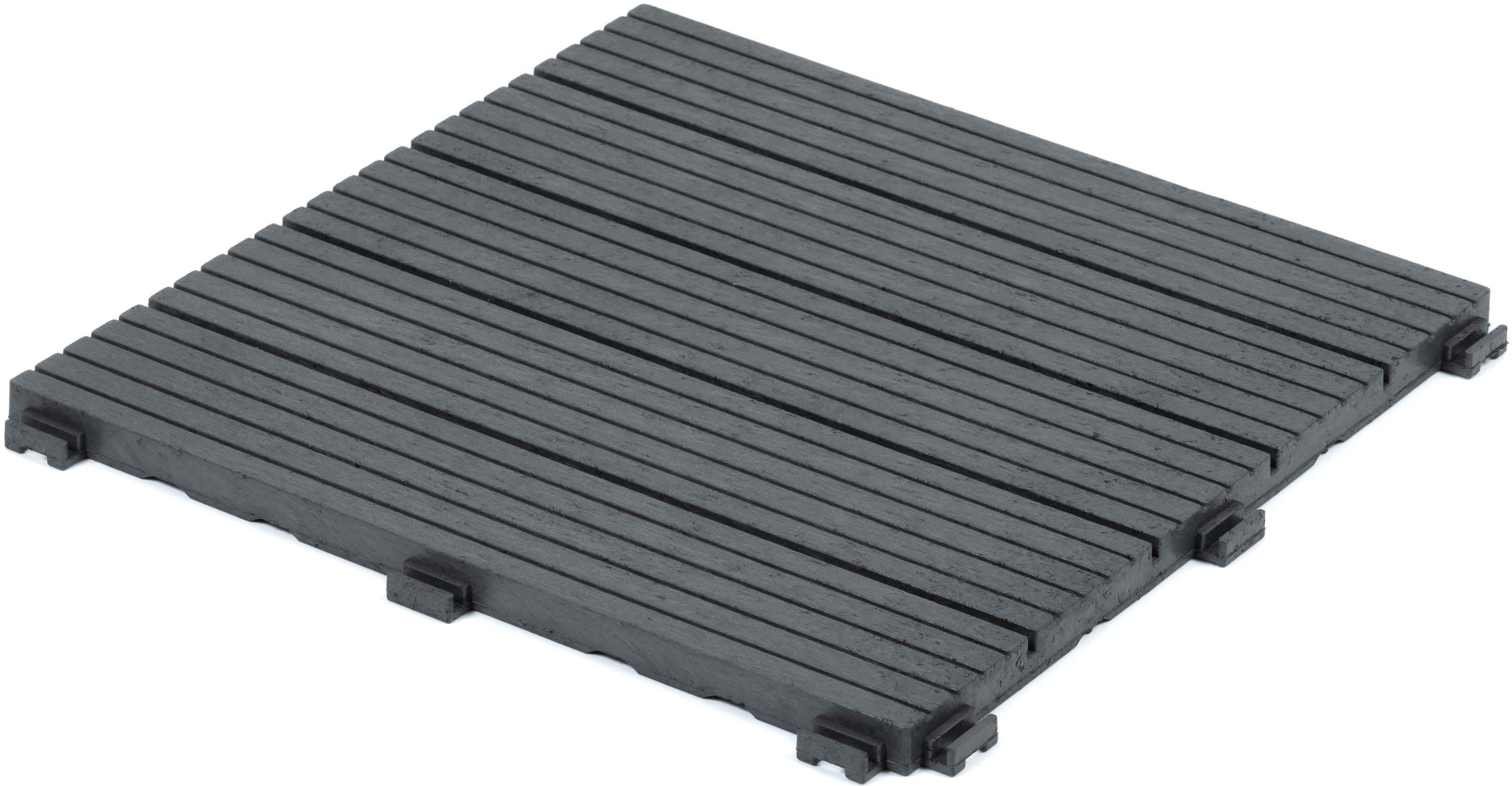 Plastová dlažba – dlaždica, recyklovateľná, odolná proti mrazu a UV žiareniu, rozmery 30 × 30 × 1,5 cm (Š×H×V), sivá farba, hmotnosť 0,7 kg