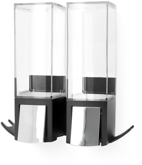 Dávkovač mydla – manuálny, nástenný, čierna farba, plastový, objem 500 ml, priezor nádržky súčasťou, ovládaný jednou rukou, dvojkomorový a s nastaviteľným dávkovaním, nalepovací, rozmery 20,6 × 20 × 8,3 cm (V׊×H), lepiaca páska súčasťou balenia…