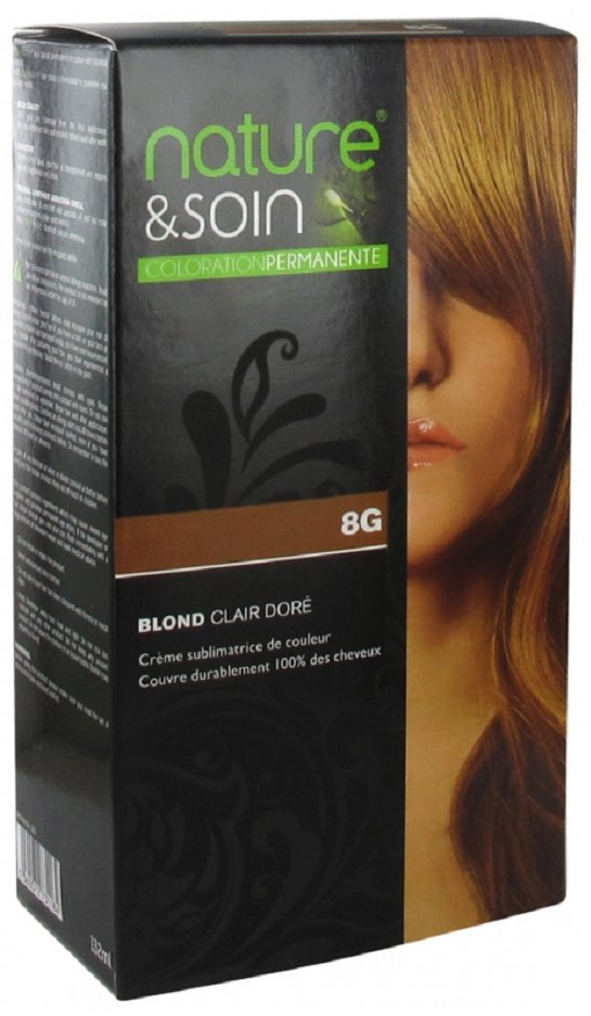 Farba na vlasy – blond, permanentná, bez amoniaku, komplexné zafarbenie a korekciu odrastov alebo šedín, na normálne, starnúce a šedivejúce vlasy, rukavice a návod v balení Farba na vlasy NATURE & CARE Light Golden Blonde 8G je navrhnutá tak, aby zaistila intenzívny farebný výsledok a spoľahlivo kryla šedivé vlasy. Zloženie umožňuje dosiahnutie rovnomerného odtieňa s
