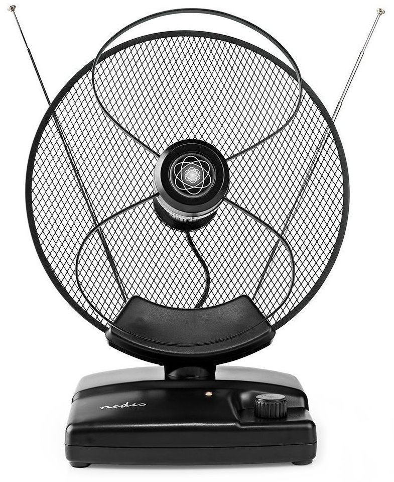 Izbová anténa – DVB-T anténa, vnútorná, aktívna, 36dB, 470–694MHz, 25km, DVB-T/T2, FM/DAB+, 4G LTE filter, napájanie zo siete, nastaviteľné zosilnenie, IEC (koax), čierna Izbová anténa Nedis DVB-T/T2 zaistí stabilný príjem voľne vysielaných a platených DVB-T/T2 kanálov a rádiového FM/DAB+ signálu. Vhodná na izbové použitie v maximálnej vzdialenosti 25 kilometrov od naj