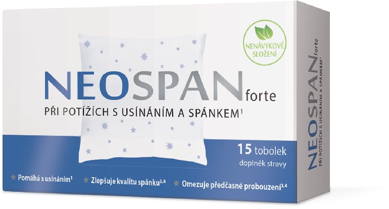 Doplnok stravy – kombinácia sušeného koreňa valeriány lekárskej (200 mg), extraktu medovky (65 mg) a mučenky (50 mg) v 1 kapsule, ďalej extrakt z chmeľu (46 mg), harmančeka (37 mg), olej z pomarančovníka horkého (5 mg), horčík (57 mg), vitamíny B1, B2 a B6, 15 kapsúl NEOSPAN forte15 kapsúlPre zdravý a kvalitný spánok po celú nocNEOSPAN forte je prírodný prípravok s extra silnou dávkou valeriány lekárskej (200 mg v 1 kapsule), doplnenú o účinky pomarančovníkového o