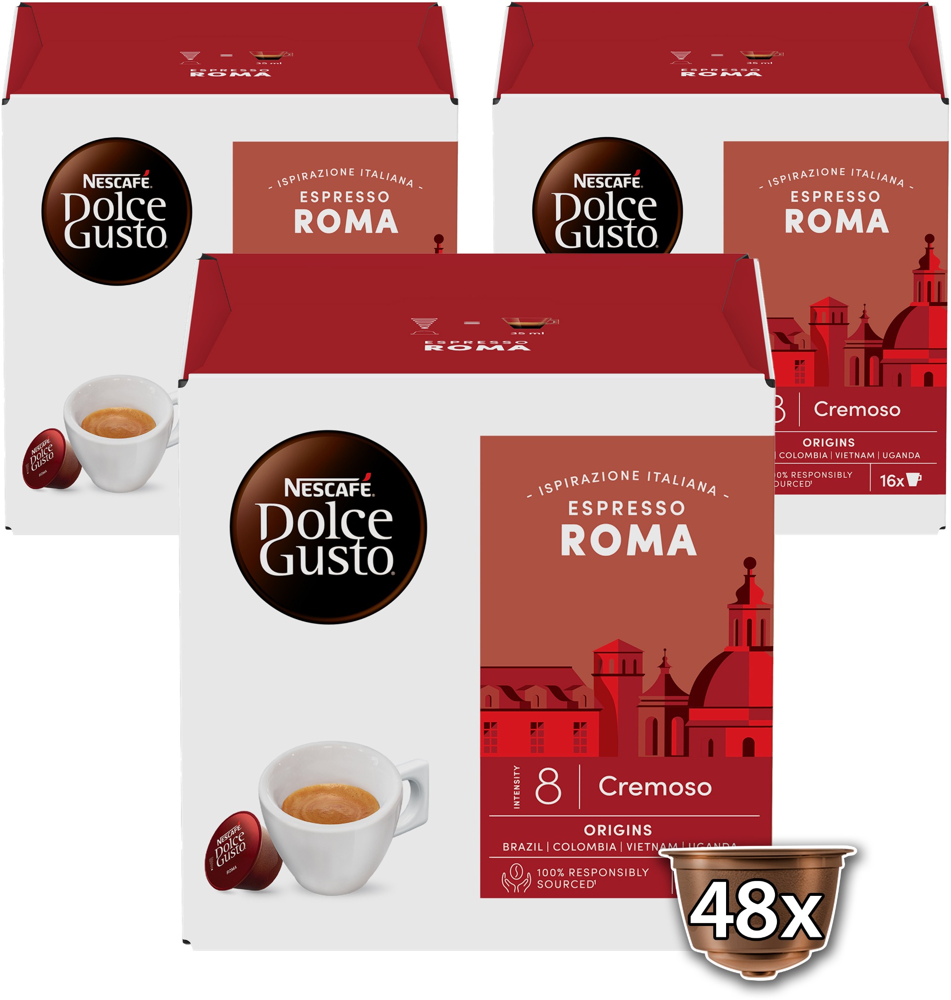 Kávové kapsuly na NESCAFÉ Dolce Gusto – na káva bez sušeného mlieka, zmes kávových odrôd, intenzita medium, pôvod kávy Kolumbia a Brazília, 48 kapsúl v balení NESCAFÉ Dolce Espresso Roma48 kapsúlVychutnajte si pulzujúcu atmosféru tejto talianskej metropoly, skrytú v tomto bohatom a silnom espresse. Jeho bohatú a guľatú chuť, vyrobenú z prémiovej zmesi zŕn A