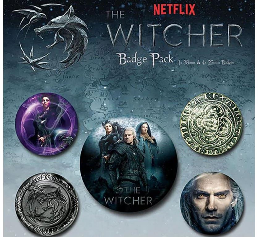 Odznak – sada 5 odznakov so spínacím špendlíkom s motívmi zo seriálu The Witcher od internetovej streamovacej spoločnosti Netflix, materiál odznakov: kov a celuloid, rozmery odznaku: 2,5 cm/3,8 cm