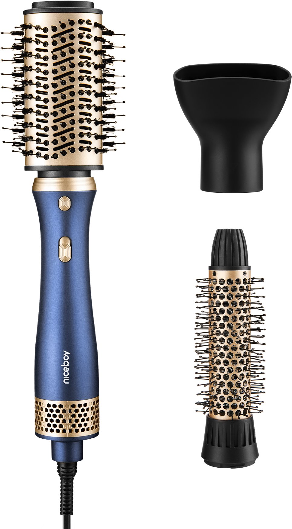 Kulmofén – 2 teploty, minimálna teplota 65 °C, maximálna teplota 100 °C, 2 rýchlosti, príkon 700 W, , 360° otočný kábel a chladná špička, dĺžka kábla 1,8 m, rozmery 5 × 26,9 × 5 cm (V׊×H), hmotnosť 0,296 kg, koncentrátor, tvarovacia kefa a teplovzdušná kefa súčasťou balenia, modrá farba Niceboy AirBlow umožní komplexný stylingKulmofén Niceboy v sebe kombinuje rovno tri zariadenia na styling vlasov: fén, kulmu a kefu. Prístroj poháňa výkonný 700 W motor. Keramický povrch zabraňuje tvo