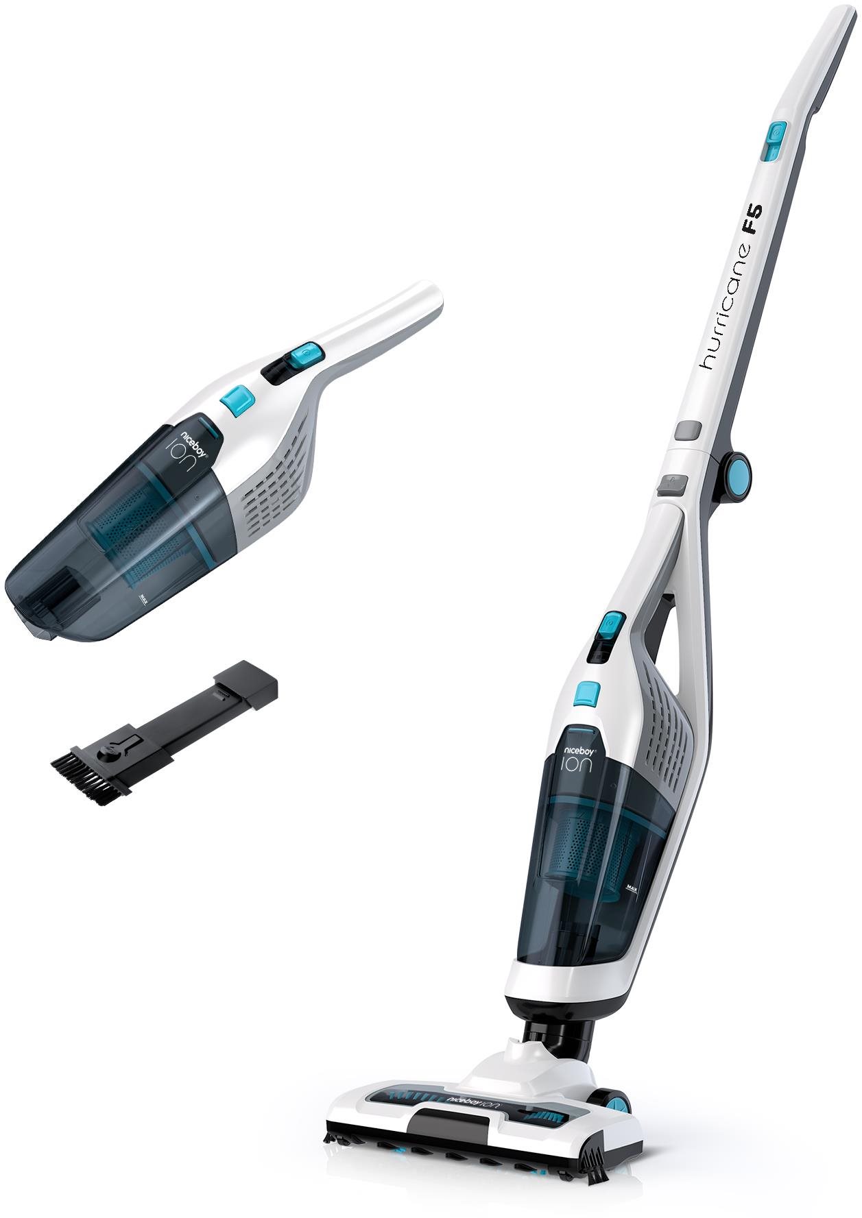Tyčový vysávač – 2 v 1, bezvreckový, aku, na všetky druhy podláh, pre alergikov, na zvieracie chlpy, antibakteriálny a na piliny, na suché čistenie, na Li-Ion batérie, doba chodu 50 min, doba nabíjania 4,5 h, indikátor nabíjania, LED osvetlenie, sklopná rukoväť a svetelné kontrolky, typ motora DC, hlučnosť 78 dB, plastová zberná nádoba s objemom 0,6 l, ovládanie na tele, rozmery 114,5 × 22,1 × 25 cm (V׊×H), hmotnosť 2,3 kg, biela farba Tyčový vysávačNiceboy ION Hurricane F5Niceboy ION Hurricane F5 je zariadenie 2 v 1, pretože kombinuje tyčový a ručný vysávač. O vysoký výkon a účinnosť vysávania sa stará silný motor s cyklónovou tech