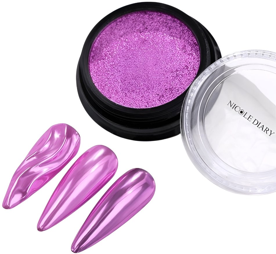 Ozdoby na nechty – trblietky, fialová farba NICOLE DIARY chrómový pigment na nechty so zrkadlovým efektom Solid chrome 7 predstavuje jemne disperzný farebný pigment, zmiešaný s magnetizovanými kovovými mikročasticami. Čiastočky prášku sú také m