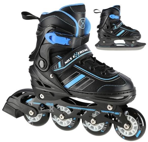 Korčule 2 v 1 – detské, rekreačné, pre začiatočníkov, vhodné na rekreačné, na zapínanie slúži suchý zips, šnúrky a pracka, nastaviteľná veľkosť, vymeniteľný podvozok, brzda a pútko na obúvanie, materiál skeletu PVC, nehrdzavejúca oceľ na nožoch, 4 kolieska s priemerom 70 mm s tvrdosťou 82A, materiál koliesok PUC, kovové ložiská ABEC 7, čierna farba Korčule 2 v 1 Nils Extreme NH18191 sú vhodné pre začínajúcich a stredne pokročilých detských korčuliarov. Vynikajú flexibilným využitím, poslúžia totiž ako kolieskové aj ako ľadové korčule. Disponujú