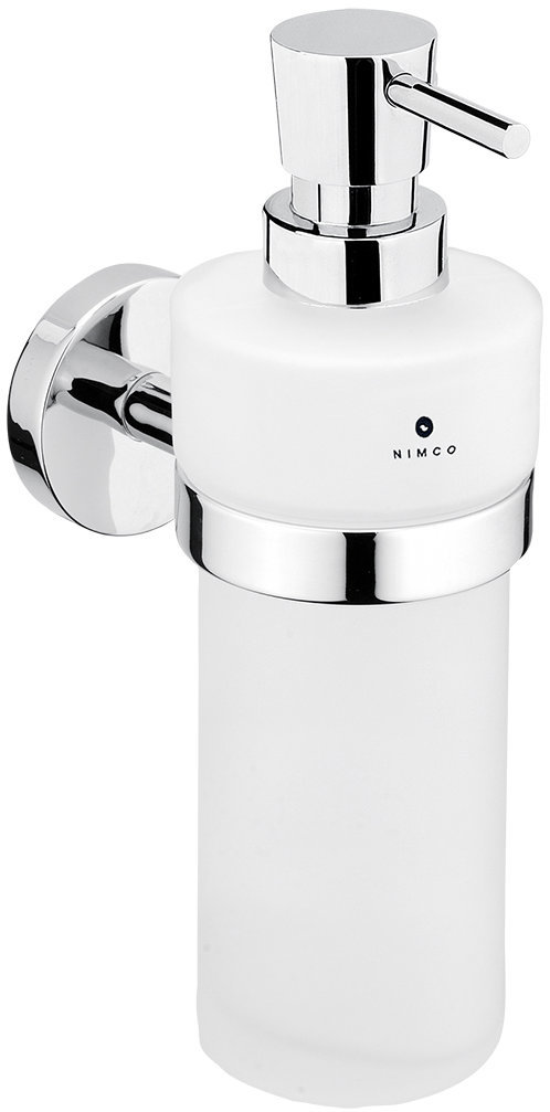 Dávkovač mydla – manuálny, nástenný, strieborná farba, mosadzný, sklenený, objem 250 ml, ovládaný jednou rukou, skrutkovací, rozmery 18,5 × 7 × 12 cm (V׊×H), dávkovacia pumpa súčasťou balenia Už sa nemôžete pozerať na stále sa povaľujúce mydlo na umývadle? Vyskúšajte dávkovač mydla NIMCO. Nádobka ponúka objem 250 ml a je možné ju opakovane plniť. Dávkovač mydla na stenu prináša veľmi čistý