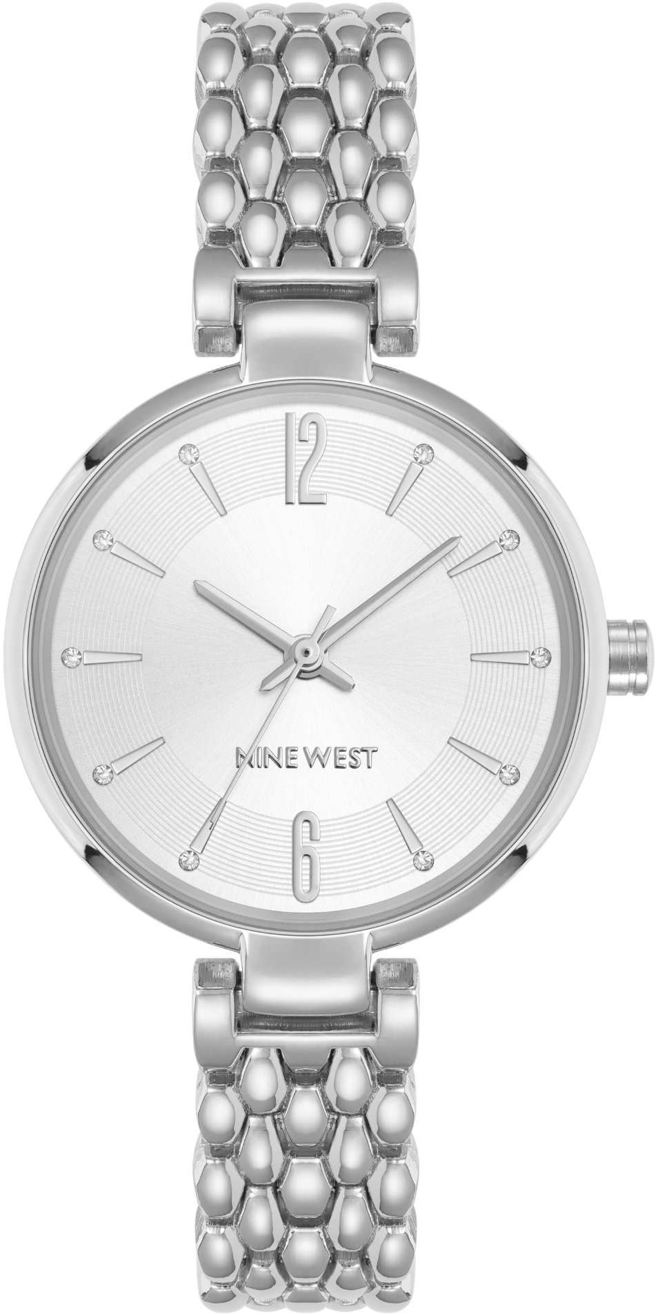Hodinky dámske – analógové zobrazenie času, strojček quartz, okrúhly ciferník, elegantné, bez číslovania, minerálne sklíčko, vodotesnosť 30 m (3 ATM), materiál puzdra oceľ, strieborná farba puzdra, materiál remienka oceľ, strieborná farba remienka, na obvod zápästia 13 – 19 cm, vlastný typ zapojenia Nine West dámske hodinky okrúhle NW/3337SVSV sú pekné dámske náramkové hodinky vhodné na každú príležitosť. Ponúknu okrúhly ciferník široký 32 mm. Efektívna Quartz technológia je synonymom nadštandard