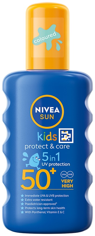 Sprej na opaľovanie – detské, ochranný faktor 50, na tvár a na telo, na citlivú, mastnú, normálnu, zmiešanú a suchú pokožku, objem 200 ml Detský ochranný sprej s ochranným faktorom 50, UVA a UVB filtre pre bezpečný pobyt na slnku a vo vode.Detský sprej na opaľovanie NIVEA SUN 50+ vám pomôže ustrážiť vášho malého nezbedníka na slnie