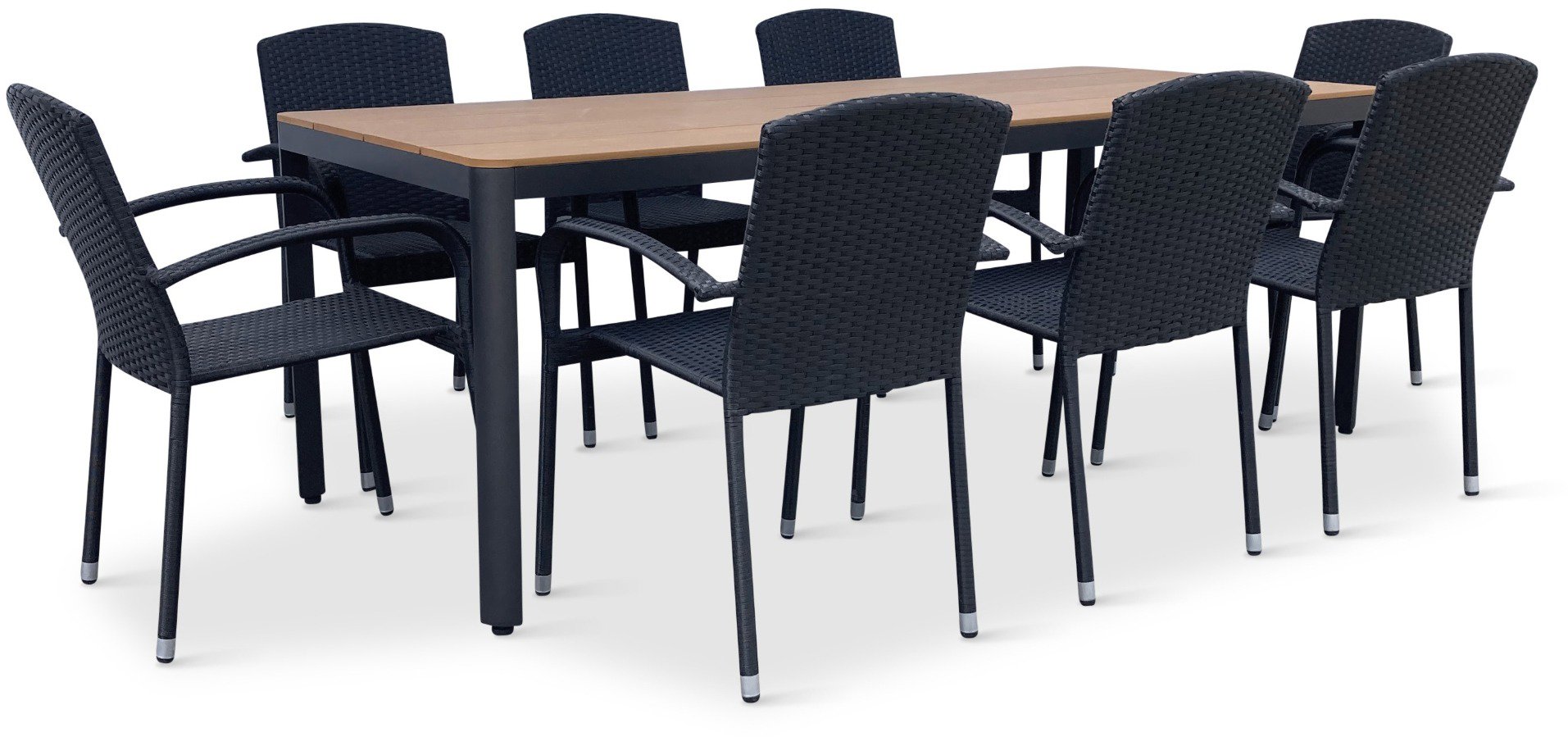 Záhradný nábytok – zostava, 8 stoličiek, nosnosť 130 kg, stôl obdĺžnik, rozmer 90 cm × 205 cm × 74 cm, materiál dosky stola kompozit, materiál sedadla/opierky chrbta lavice umelý ratan Súprava záhradného nábytku NOELA sa…