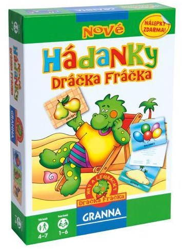 Spoločenská hra – detská, vedomostná a náučná, pre 1 až 6 hráčov, dĺžka hry 30 min, v českom jazyku, vhodné od 4 rokov Nové hádanky dráčika Fráčka rozvíja nielen slovnú zásobuSpoločenská hra s názvom Nové hádanky dráčika Fráčka rozvíja logické myslenie, detskú slovnú zásobua posilňuje schopnosť sústredenia. Hra dokáž