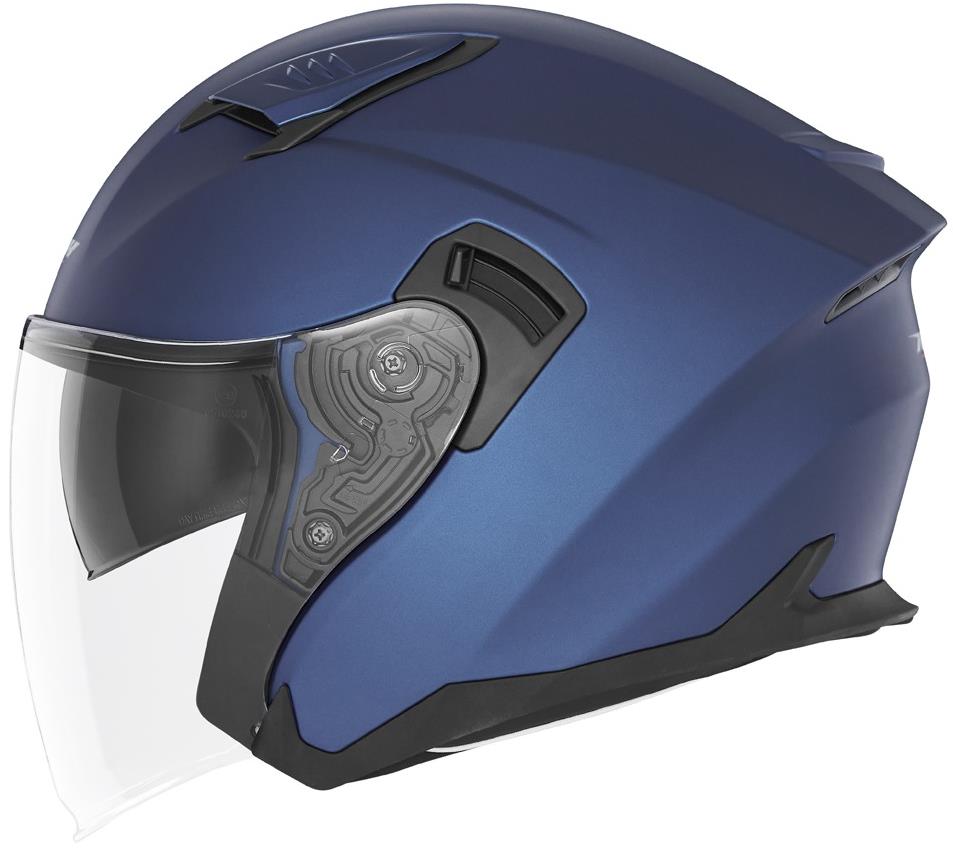 Prilba na motorku – materiál škrupiny polykarbonát, homologizácia ECE 22.06, plexi antiscratch, príprava na pinlock, integrovaná slnečná clona, vyberateľný interiér, odnímateľné lícnice, príprava na interkom, mikrometrická pracka, hmotnosť 1450 g (± 50 g), modrá farba, veľkosť XXL, matná povrchová úprava, športový dizajn Prilba na motorku NOX je kľúčovým prvkom bezpečnosti motorkára a pri nehode pomáha rozložiť silu nárazu, čím chráni hlavu pred poranením. Otvorené riešenie pokrýva len vrchnú časť hlavy aj oblasť uší,