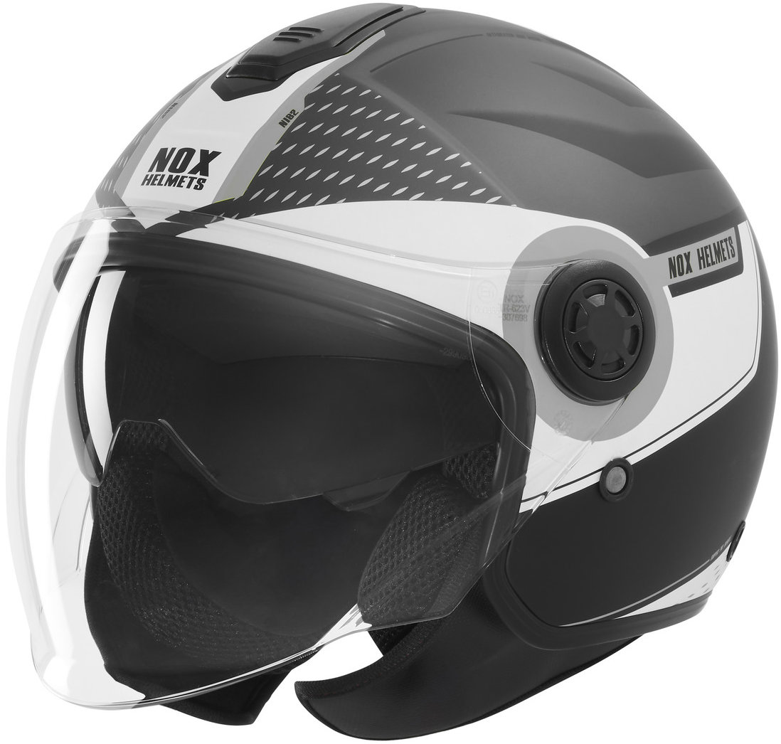 Prilba na motorku – materiál škrupiny polykarbonát, homologizácia ECER22.06, plexi antiscratch, integrovaná slnečná clona, vyberateľný interiér, odnímateľné lícnice, príprava na interkom, mikrometrická pracka, hmotnosť 1450 g (± 50 g), čierna farba, veľkosť XL, matná povrchová úprava, športový dizajn Prilba na motorku NOX je nevyhnutným bezpečnostným prvkom a pri nehode zaisťuje ochranu hlavy tým, že tlmí a pohlcuje nárazy. Otvorené riešenie kryje iba hornú časť hlavy a uši, takže umožňuje dobré o