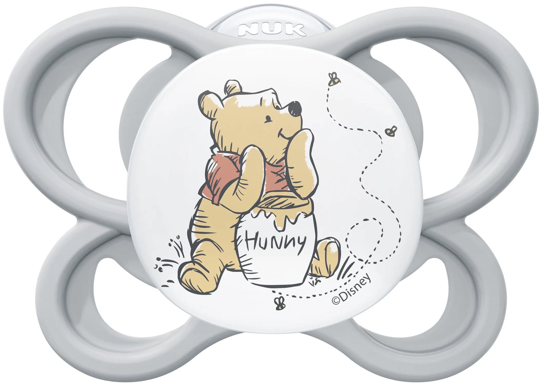 Cumlík – pre deti od narodenia, silikónový, asymetrický cumeľ (ortodontický) Cumlík NUK Perfect Match Air Disney Medvedík Pú Grey je silikónový ortodontický cumlík určený pre deti od narodenia do 6 mesiacov. Je navrhnutý s ohľadom na zdravý vývoj zúbkov a čeľuste, s minimálnym