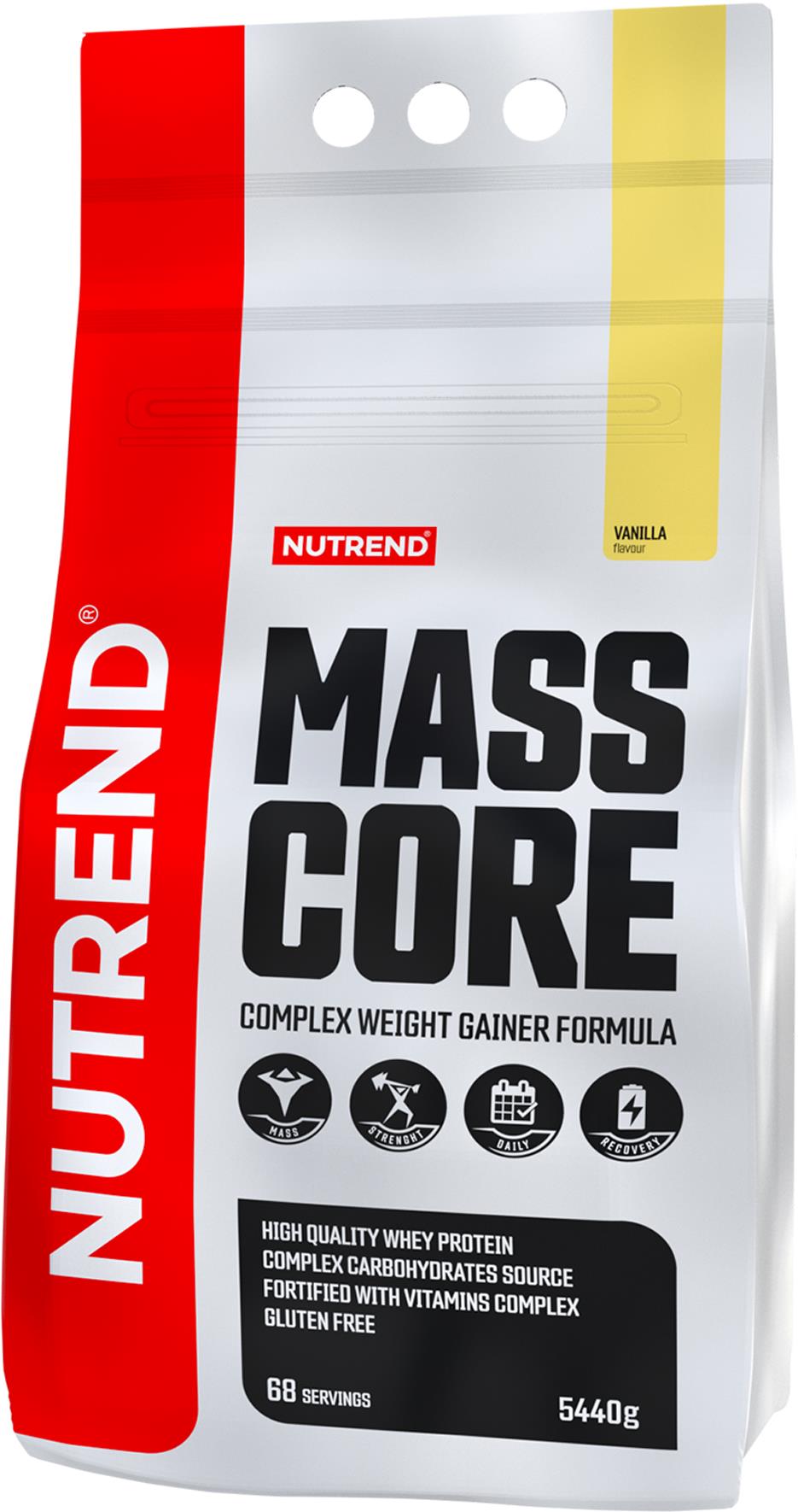 Gainer – príchuť: vanilka, all in one, obsah bielkovín 15 %, energetická hodnota 382 kcal/100 g, hmotnosť balenia 5440 g Nutrend Mass CoreVanilka, 5 440 gGainer Nutrend Mass Core využijú športovci rôznych odvetví. Kombinuje 4 druhy sacharidov so zmesou 10 vitamínov. Obsahuje maltodextrín, srvátkový proteínový koncentrát
