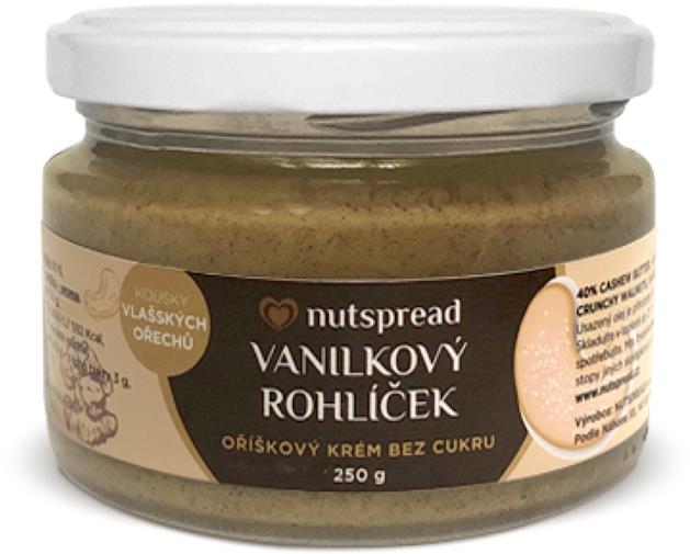 Orechový krém – chrumkavý, kešu, príchuť vanilka, 13 g bielkovín na 100 g, 592 kcal na 100 g, neobsahuje lepok, bez palmového oleja, hmotnosť 250 g Vanilkový rožok Nutspread250 gVanilkový rožok Nutspread je orechový krém, ktorý v sebe spája vlašské orechy z českých záhradiek, neodolateľne smotanový krém z orieškov kešu a štipku nezameniteľnej van