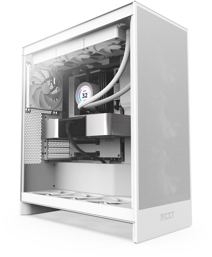 PC skrinka – ATX, mATX (Micro ATX), mITX (Mini ITX) a eATX (Extended ATX), 2× 3,5″, 2× 2,5″, Konektory predného panelu USB 3.2 Gen 1, USB-C, 3,5 mm Jack (mikrofón/slúchadlá) a USB 3.2 Gen 2, počet predinštalovaných ventilátorov 3× 120 mm, max. výška chladiča 185 mm, max. dĺžka grafickej karty 410 mm, bez zdroja, materiál bočnice temperované sklo, bez podsvietenia PC skrinka NZXT H7 Flow (2024) All White s veľkosťou Midi Tower prináša pútavý dizajn, na ktorom preváži biela farba. Tá je aplikovaná na oceľovej konštrukcii. Midi Tower je prísľubom na konštrukciu p