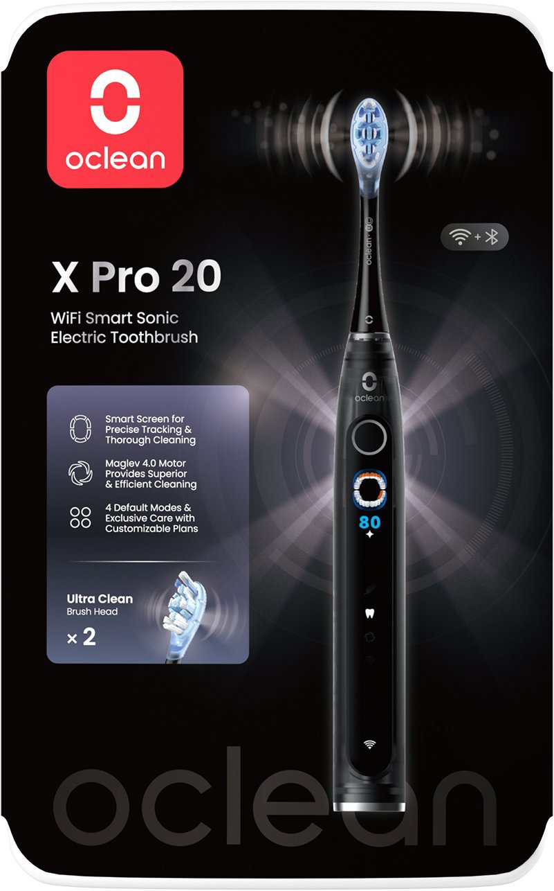 Elektrická zubná kefka – sonická, 84000 pohybov za minútu, 4 režimy, časovač, indikátor batérie a 3D mapovanie, v balení 2 hlavice, s mobilnou aplikáciou Elektrická zubná kefka Oclean X Pro 20 Black kombinuje špičkovú technológiu so zábavou pri osobnej starostlivosti. Disponuje funkciou sledovania 12 kľúčových oblastí v ústnej dutine a čistenie potom v