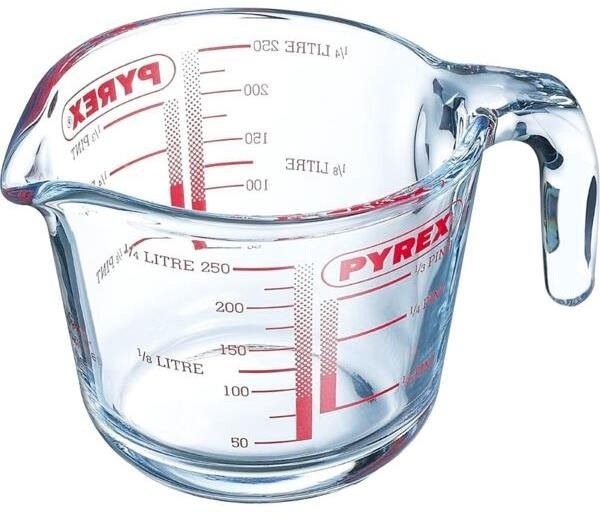 Kuchynská odmerka – sklenená, jednotky ml, celkový objem 250 ml, ucho súčasťou, odolnosť proti teplotným šokom, umývaniu v umývačke a ohrievaniu v mikrovlnnej rúre, odoláva teplotám do 300 °C, výška 8 cm, transparentná farba Zásadné prednosti produktu Odmerka sklo Pyrex 250 mlKuchynská odmerka Pyrex je nevyhnutná na dodržanie receptovSprávne dávkovanie všetkých prísad je zásadné na vyváženú chuť i konzistenciu pokrmovOdme