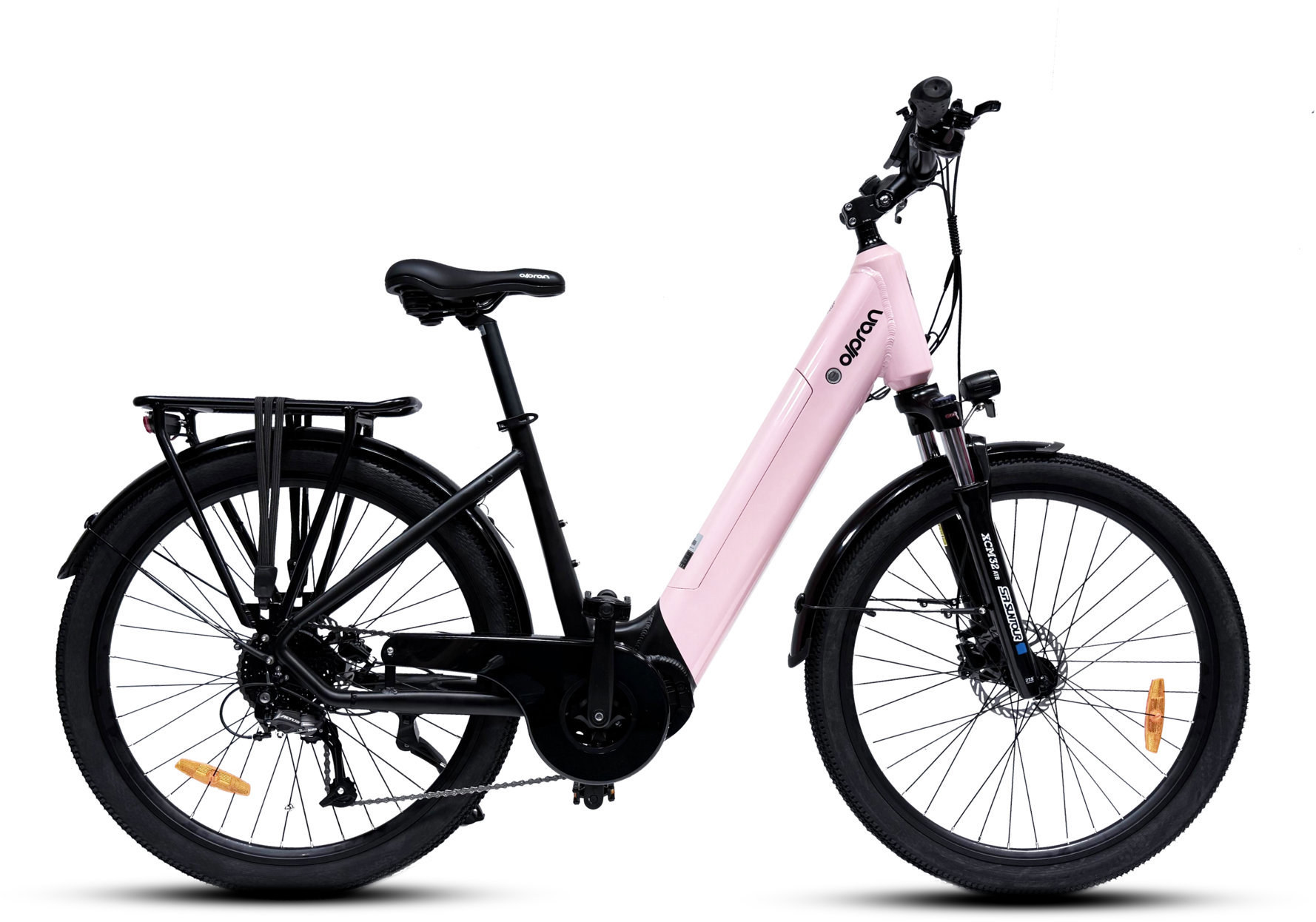 Elektrobicykel – 27,5″, pánsky/dámsky, max. dojazd 160 km, kapacita batérie 720 Wh, max. rýchlosť 25 km/h, krútiaci moment 85 Nm, s motorom Bafang v strede bicykla, hliníkový rám, veľkosť rámu M, výška rámu 457,2 mm, pružinová vidlica a odpružená predná vidlica, hmotnosť jazdca do 120 kg Olpran Bellis Low 27,5″ pink/black 18″Terénní elektrokoloOlpran Bellis Low 27,5″ je pohodlné a bezpečné dámské elektrokolo navržené pro jízdu v terénu i na cyklostezkách. Díky nízkému a odolnému dural