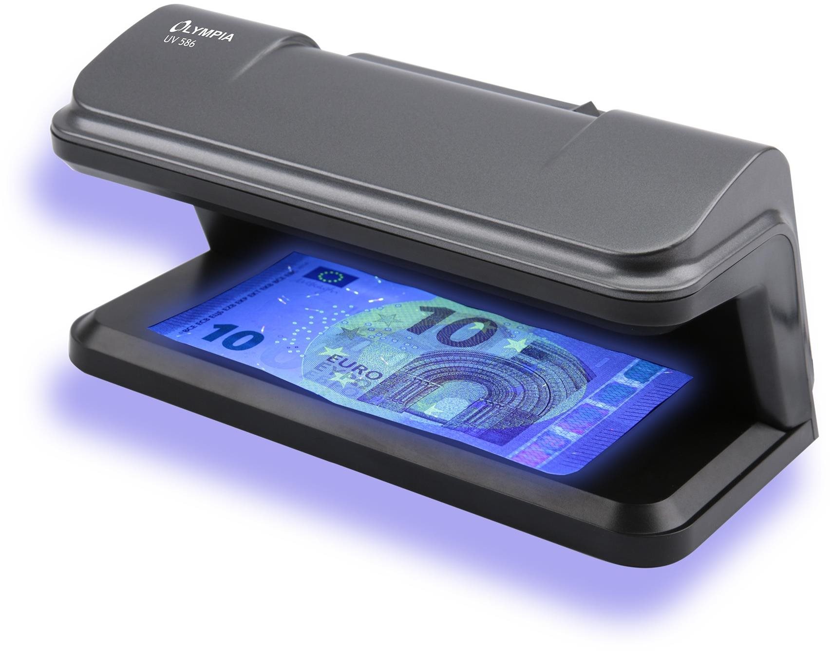 Detektor falzifikátov – stolný, UV detekcia, podporované meny CZK, EUR, GBP a USD, vizuálna signalizácia, napájanie do siete, príkon 10 W, napájací kábel v balení, rozmery 95 × 192 × 95 mm (V׊×H), hmotnosť 380 g Detektor OLYMPIA UV 586 odhalí nielen falšované bankovky, ale slúži aj na kontrolu vstupeniek, stravných lístkov, kreditných kariet a ďalších cenín, ktoré obsahujú UV bezpečnostné prvky. Jeho