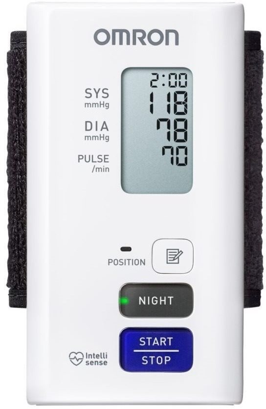 Tlakomer na zápästie – oscilometrická metóda merania, meria systolický tlak, diastolický tlak, pulzovú frekvenciu a arytmiu, meranie tlaku od 40 do 260 mmHg s presnosťou 3 mmHg, meranie tepu od 40 do 180 s presnosťou 5 %, manžeta pre max. obvod 21,5 cm, automatické zapnutie, indikácia správne nasadenej manžety, indikácia stavu batérie a inteligentné, v pamäti udrží 350 meraní, na 2 AAA batérie, ochranný obal a batéria v balení, biela farba, rozmery 10,1 × 5,5 × 1 cm (V׊×H), hmotnosť 100 g Tonometer OMRON NightView prináša revolúciu v meraní tlakuVyžaduje váš zdravotný stav pravidelnú kontrolu krvného tlaku? A to ideálne nielen cez deň, ale aj počas noci? Potom by vašej pozornosti rozho