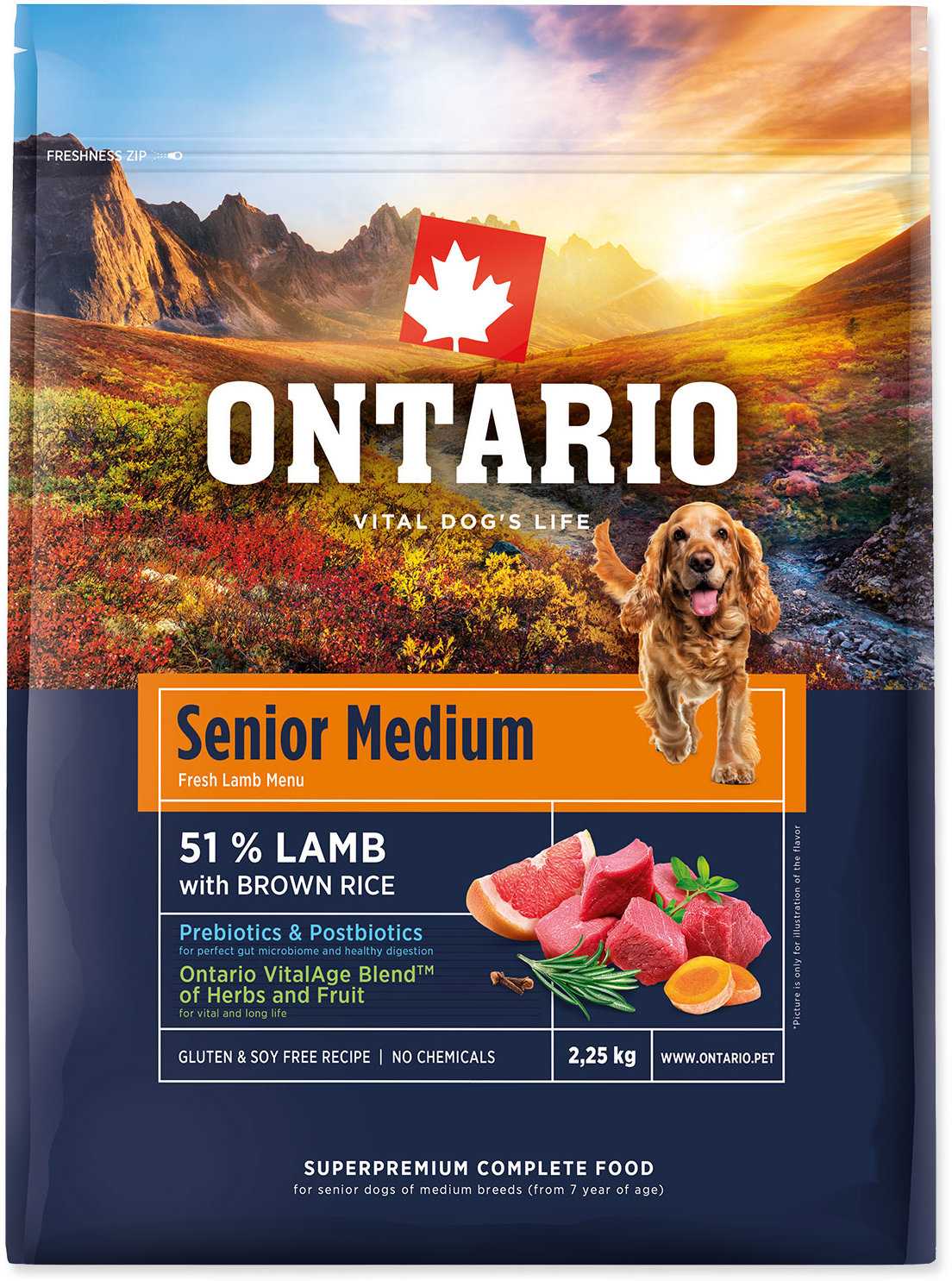 Granuly pre psov – pre stredné plemená seniorského veku s normálnou aktivitou, jahňacia príchuť, hmotnosť balenia 2,25 kg, suché, hrubé bielkoviny 25 %, tuky (lososový) 12 %, s kĺbovou výživou, špecifiká zloženia s obsahom juky, ľanové semienko a probiotiká Chutné krmivo Ontario Senior Medium Lamb & Brown Rice s kvalitným jahňacím mäsom a hnedou ryžou je ideálnou voľbou pre starších psov stredných plemien. Podporuje zdravé trávenie, silné svaly, krás