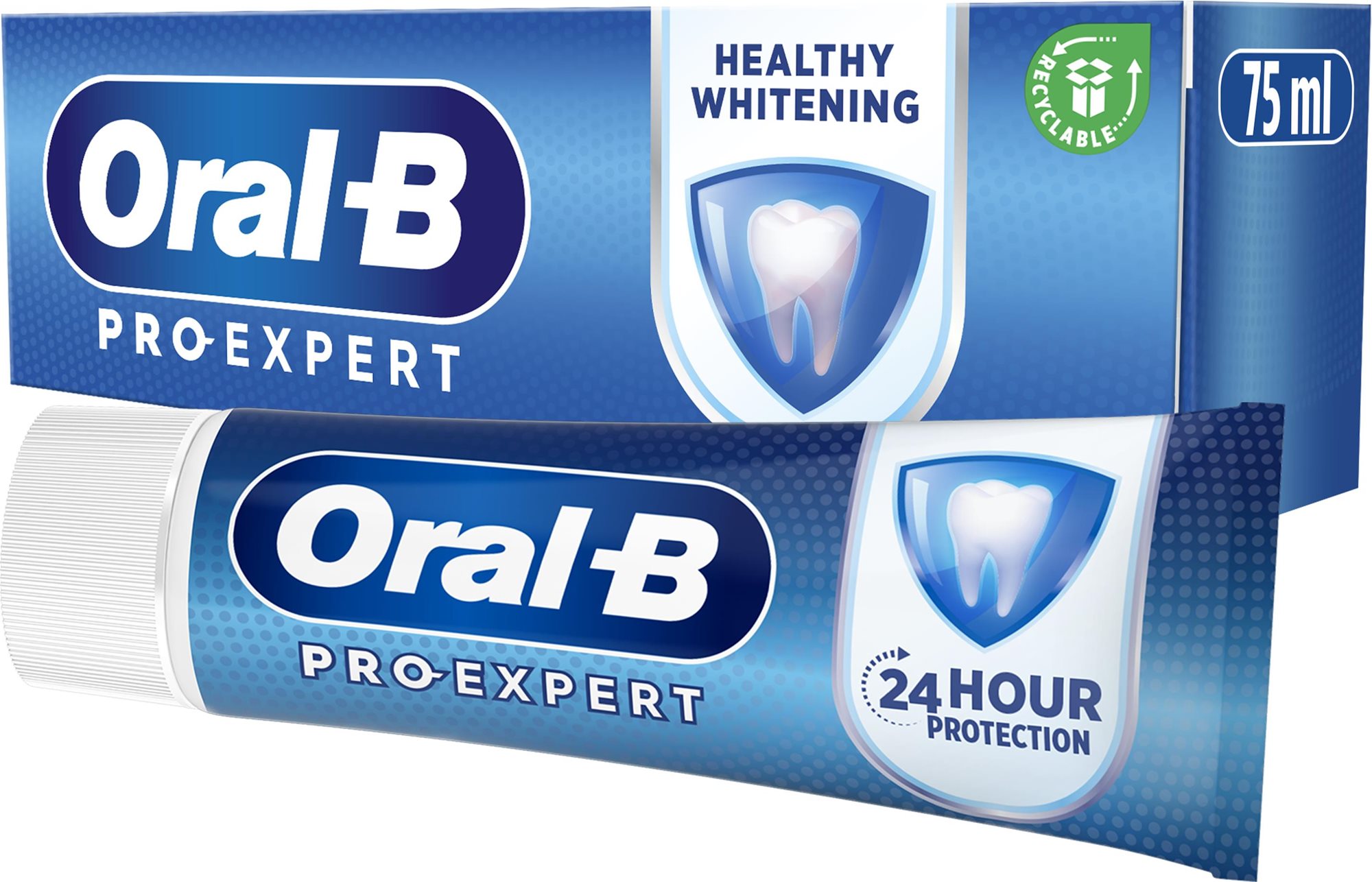 Zubná pasta – chráni pred zubným kazom, mentolová príchuť, objem 75 ml Zubná pasta Oral-B Pro-Expert Healthy Whitening bieli odstraňovaním povrchových škvŕn apri čistení dvakrát denne poskytuje 24-hodinovú ochranu proti zubnému plaku. Ľudia viac ohrození zubnými kazmi si