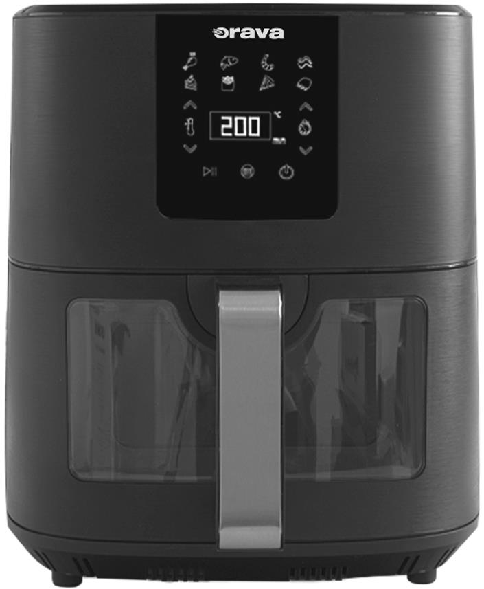 Teplovzdušná fritéza – digitálne ovládanie, nastaviteľná teplota od 40 do 200 °C, s nepriľnavým povrchom, s displejom, s ochranou proti prehriatiu, s termostatom, s vekom s priezorom, časovač, udržanie teploty, automatické vypnutie, regulácia teploty, odložený štart a automatické programy, 8 programov, príkon 1700 W, objem nádoby 7 l s nepriľnavým povrchom, 1 fritovací kôš, dĺžka kábla 1,2 m, hmotnosť 5,2 kg, rozmery 39 × 30 × 34 cm (V׊×H), čierna farba Teplovzdušná fritéza Orava vám pomôže pripraviť obľúbené pochúťky s čo najmenším obsahom tuku. Nádoba fritézy disponuje nadštandardným objemom 7 l. Zásluhou nepriľnavého povrchu nedôjde k prichyteniu