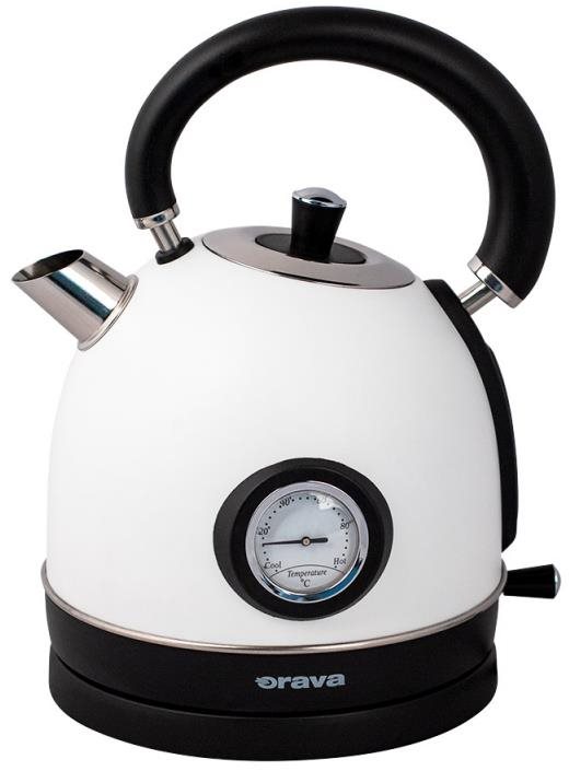 Rýchlovarná kanvica – retro dizajn, antikorová, objem 1,8 l, biela farba, príkon 2200 W, úložný priestor na kábel, automatické vypnutie, ukazovateľ teploty vody Rýchlovarná kanvica Orava Retro kanvica s analógovým teplomerom v bielom vyhotovení, perfektne poslúži na prípravu teplých nápojov, čaju, kávy. Varná kanvica s objemom 1,8 l vás na prvý pohľad zaujme