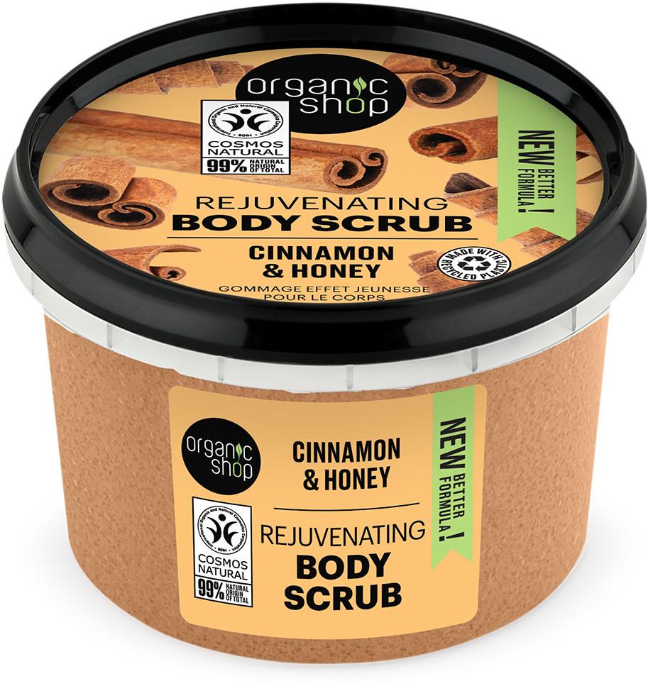 Peeling na telo – dámsky, bio a prírodné zloženie, pre mastnú, normálnu, zmiešanú, suchú a zrelú pleť, s prírodným olejom a s prírodnými zložkami, objem 250 ml Organic Shop prírodný omladzujúci telový peeling s organickým výťažkom zo škorice, organickým medom a prírodným cukrom. Doprajte svojej pokožke luxusnú starostlivosť s týmto aromatickým peelingom na t